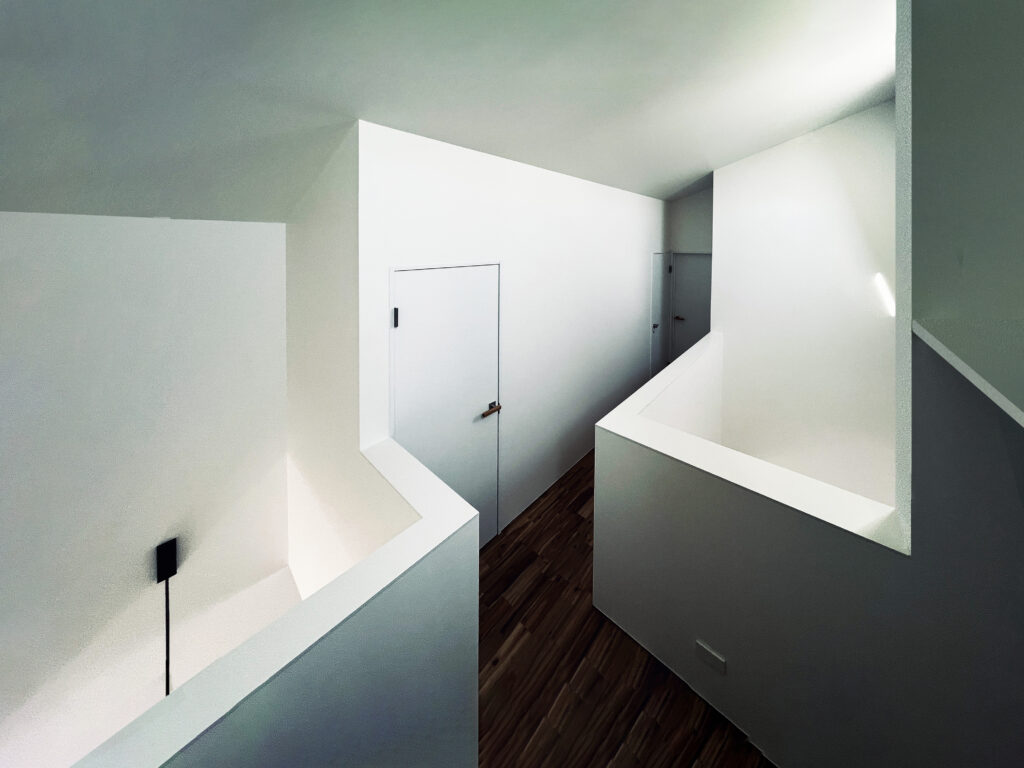 大きな吹き抜け一つでダイレクトに階を繋ぐのではなく、大小2つの吹き抜けを千鳥状に配置し、上下階の家族の気配が滲む吹き抜けにしました。太陽の光も、これらの吹抜けのトップライトから浴びれます。白く光沢のあるクロスにすることで、日の光とフローリングの相互反射が室内にうつろっていきます。